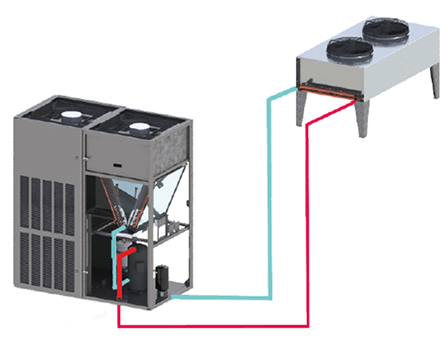 由機組室內(nèi)風(fēng)機驅(qū)動機房內(nèi)空氣流動,在此過程中室內(nèi)空氣流經(jīng)空調(diào)蒸發(fā)器,將熱量傳遞給制冷劑,制冷劑經(jīng)由制冷系統(tǒng)管道輸送到室外,通過冷凝器將熱量散播到室外環(huán)境中??照{(diào)機組和室外冷凝器通過封閉的制冷管道相連。