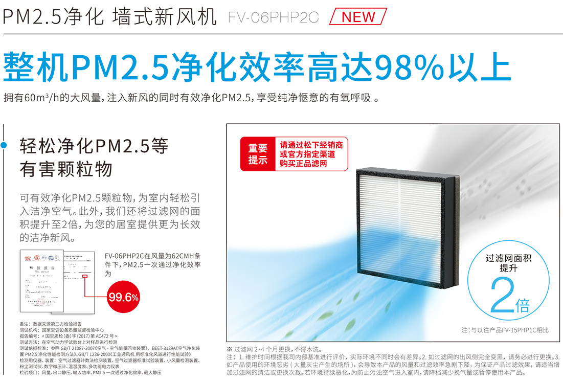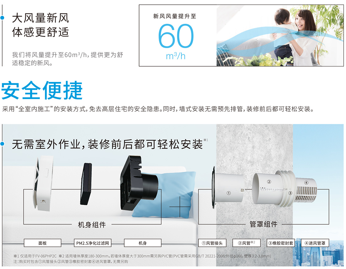 為貼心而生的新風(fēng)系統(tǒng)、濾網(wǎng)面積更大,整機(jī)凈化效率達(dá)到98%以上、風(fēng)量60m3/h、無(wú)需預(yù)先排管,安裝便捷