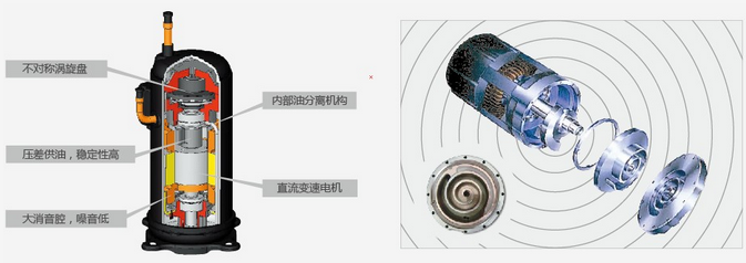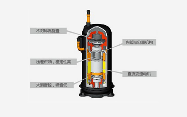 大容量的高壓腔渦旋壓縮機采用內(nèi)部油分離機構(gòu),通過內(nèi)部油霧分離器專利設計和內(nèi)部回油管設計,使壓縮機潤滑油大部分保存在壓縮機內(nèi),只有少量油被帶出壓縮機,有效防止因多余的冷凍油在制冷循環(huán)中造成的能力下降,效率進一步提高;采用防過壓縮技術,有效的防止了冷凝壓力過高而造成的功耗增加問題,壓縮機運轉(zhuǎn)更節(jié)能,同時使得制冷系統(tǒng)更加穩(wěn)定可靠。