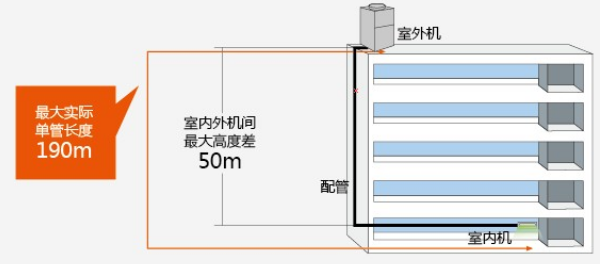 日立新風機最大單管長度增加到190米,室內(nèi)機與室外機的高度差可達50米,方便安裝。