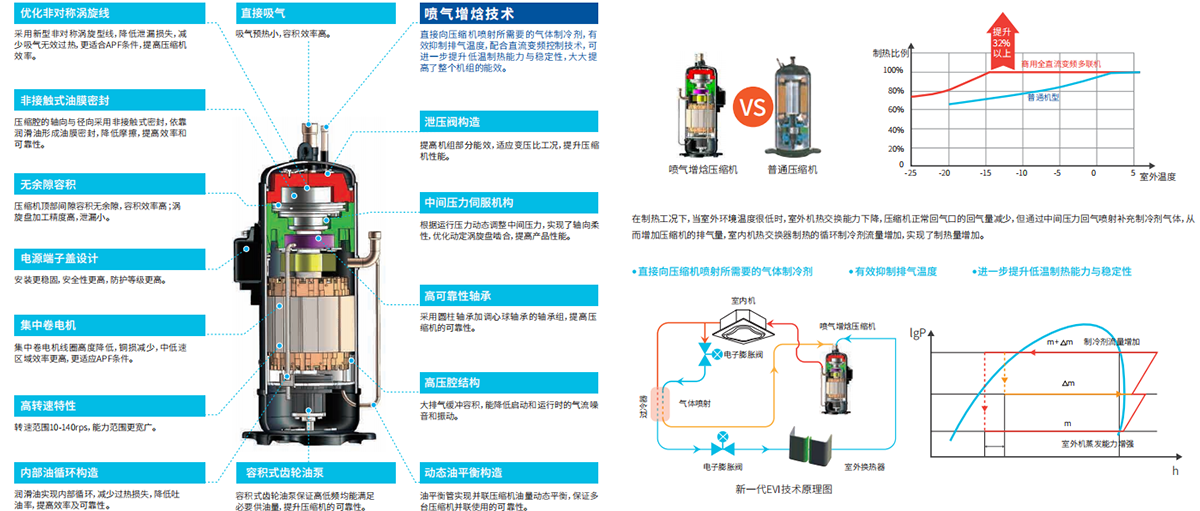 內(nèi)核驅(qū)動控制、高性能直流變頻噴氣增焓渦旋式壓縮機、壓縮機智控技術(shù)、可靠系統(tǒng)結(jié)構(gòu)設(shè)計