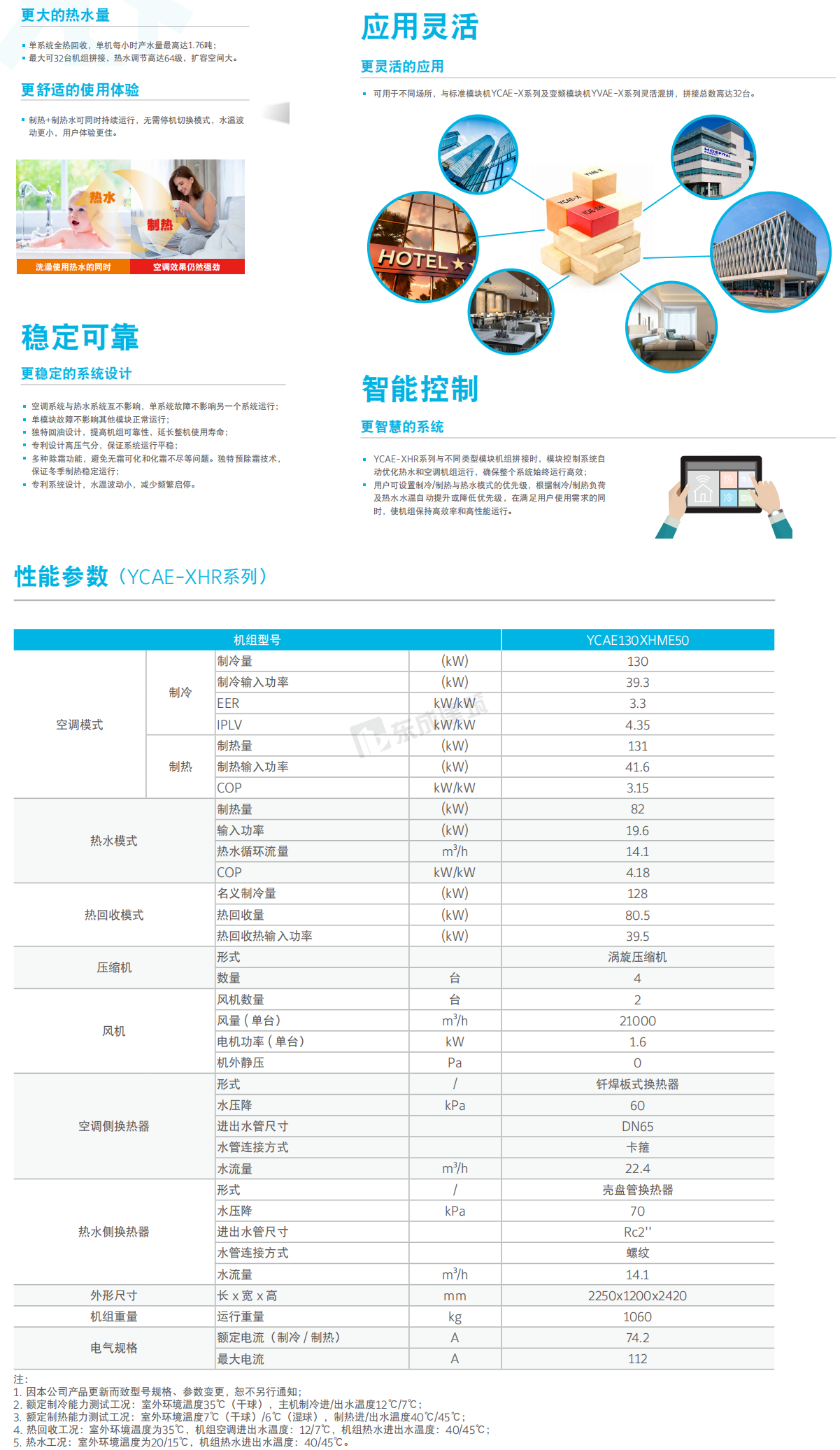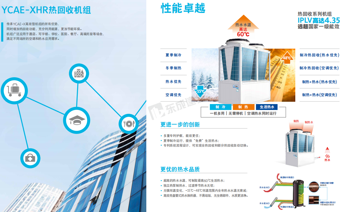 約克模塊式風(fēng)冷冷水/熱泵機(jī)組傳承YORK®多年模塊機(jī)設(shè)計(jì)、制造、運(yùn)行和服務(wù)經(jīng)驗(yàn),致力于打造約克YCAE-X高效型機(jī)組,性能卓越、穩(wěn)定可靠、智能控制、應(yīng)用靈活和低碳環(huán)保的機(jī)組, 為客戶提供更高效節(jié)能。X-Power系列以其超高效的性能引領(lǐng)模塊式風(fēng)冷冷水/熱泵機(jī)組市場(chǎng)。 在YCAE-X機(jī)組的優(yōu)異平臺(tái)上,約克持續(xù)創(chuàng)新,開(kāi)發(fā)全新一代YCAE-XHR熱回收機(jī)組, 滿足客戶更多的應(yīng)用需求。傳承YCAE-X高效型機(jī)組的所有優(yōu)勢(shì),同時(shí)增加熱回收功能,充分利用能源,更加節(jié)能環(huán)保。機(jī)組廣泛應(yīng)用于酒店、寫(xiě)字樓、學(xué)校、醫(yī)院、餐廳、高端民宿等場(chǎng)合,滿足不同場(chǎng)所的空調(diào)和熱水應(yīng)用需求。 |