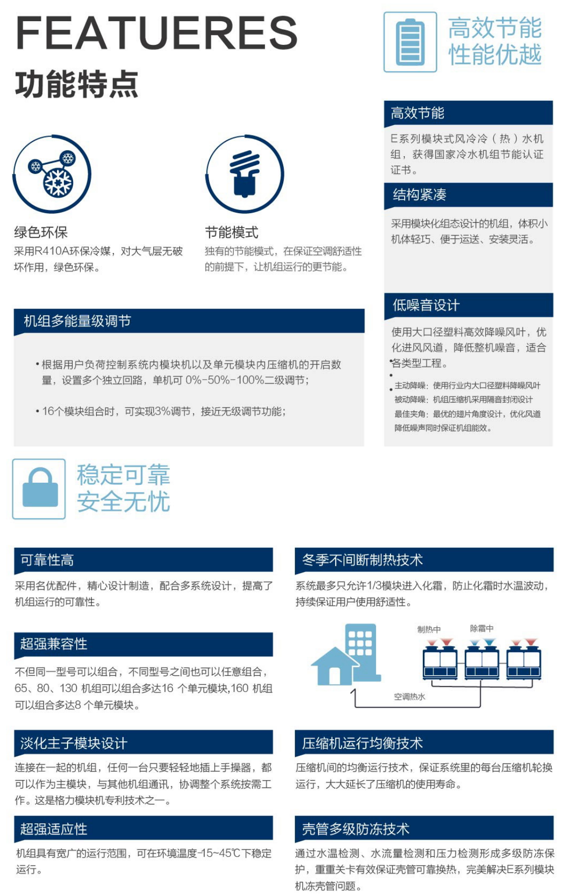 產(chǎn)品概述 格力E系列模塊式風(fēng)冷冷(熱)水機(jī)組?格力在D系列模塊式風(fēng)冷冷(熱)水機(jī)組的基礎(chǔ)上,不斷開拓創(chuàng)新,開發(fā)岀新一代?節(jié)能環(huán)保產(chǎn)品:E系列模塊式風(fēng)冷冷(熱)水機(jī)組。該機(jī)組可組合多個(gè)單元模塊,?每個(gè)單元模塊的名義制冷量不同,有65kW、80kW、130kW. 160kW 可選。?65、80、130機(jī)組每個(gè)單元模塊有兩個(gè)完全獨(dú)立的制冷系統(tǒng),160 贈(zèng)每個(gè)單元?模塊有四個(gè)完全獨(dú)立的制冷系統(tǒng)。通過組合1 ~ 16個(gè)相同或不同的單元模塊,機(jī)?組形成制冷量在65 ~ 2080kW范圍的系列產(chǎn)品。65、80、130機(jī)組可以組合多?達(dá)16個(gè)單元模塊,160機(jī)組可以組合多達(dá)8個(gè)單元模塊。?E系列模塊式風(fēng)冷冷(熱)水機(jī)組廣泛應(yīng)用于新建和改建的大小2DIE與民用建筑空?調(diào)工程。對(duì)噪音和周圍環(huán)境有較高要求、不便安裝冷卻塔的工程,模塊式風(fēng)冷冷?(熱)水機(jī)組更是您理想的選擇。 |
